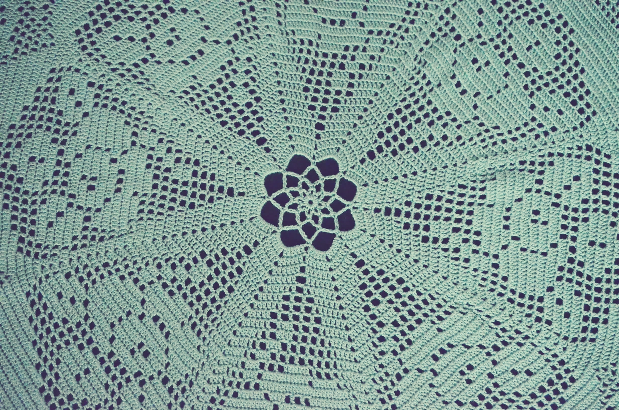 Handarbeit – Nach einem altem Muster von Hand gehäkelt ist diese grüne runde Tischdecke