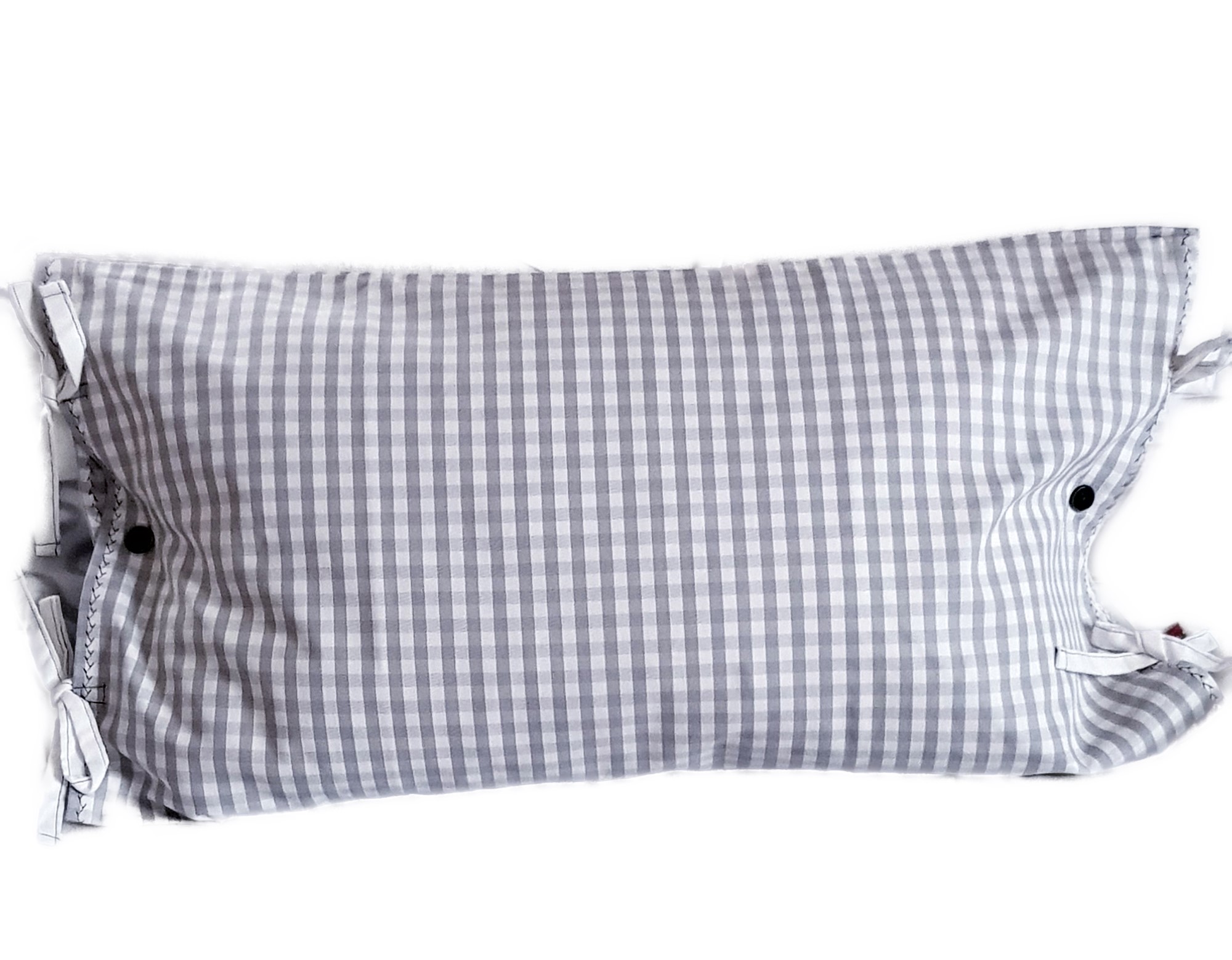 Dieser Kissenbezug ist dezent grau weiß kariert mit dekorativer Schlaufenbindung.