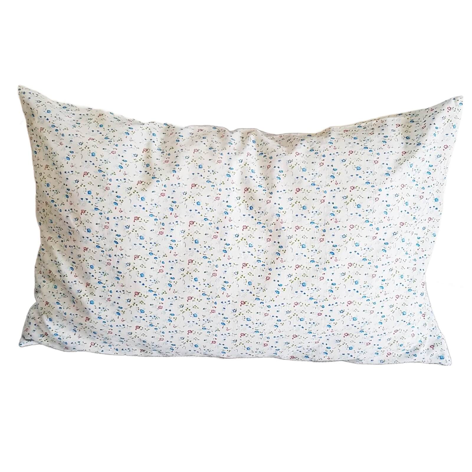 Der Kissenbezug passt wegen seiner Farbgebung in blau, weiß, rot mit Blümchenmuster gut als Beikissen im Schlafzimmer zu einer weißen, roten, blauen oder unifarbigen Betttwäsche.