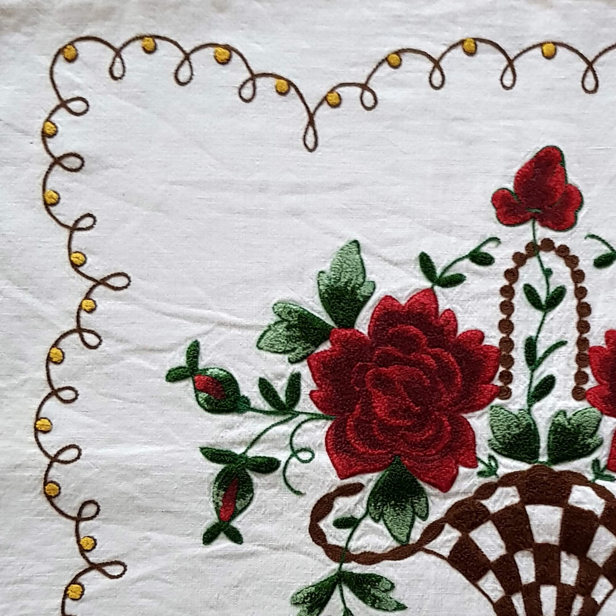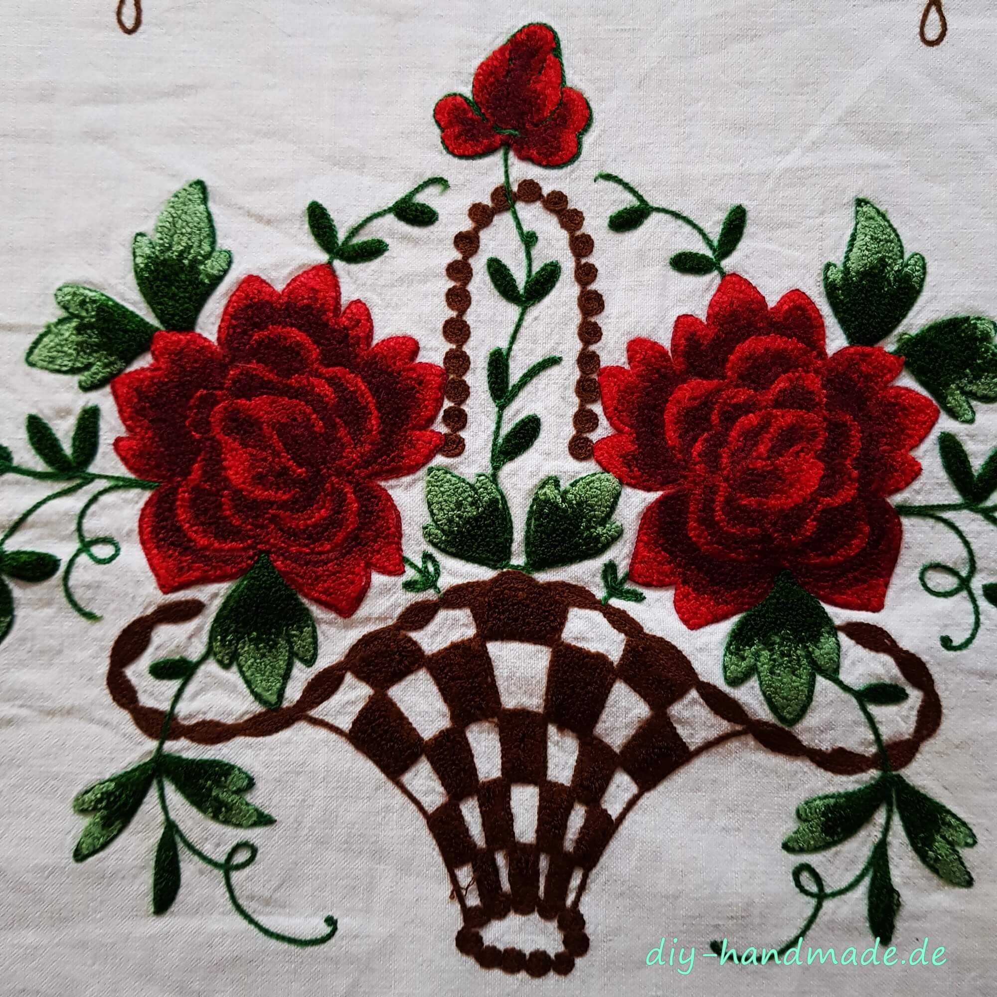 Couchkissenüberzug aus Leinen, bestickt in Rot.