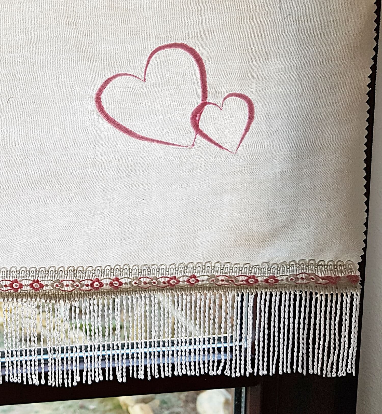 Mit diesem verliebten Motiv, einem Brautpaar und zwei Herzen, ist die Scheibengardine ein echter Blickfang an jedem Fenster.